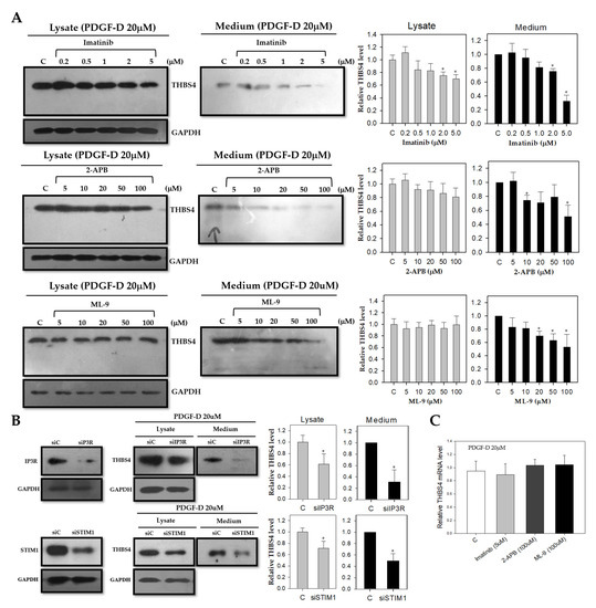 Previous literature shows a Ca2+ binding domain in the C-terminal region of THBS4 [6,7,8,9]. Therefore, we also suspected that the Ca2+ signaling proteins, IP3R and STIM1, might be involved in THBS4 activity. To investigate this idea, we treated DLD-1 cells with the IP3R inhibitor, 2-APB, and a STIM1 inhibitor, ML-9, at concentrations of 5, 10, 20, 50, and 100 μM for 16 h. We also administered an additional treatment with PDGF-D for 8 h. Similar to PDGFRβ inhibition, we found decreased expression of THBS4 in the culture medium under 2-APB or ML-9 (Figure 4A, middle and lower panel). Despite rescue treatment with PDGF-D in siIP3R-transfected and siSTIM1-transfected DLD-1 cells, THBS4 levels remained at reduced levels in the lysate and cultured medium (Figure 4B). However, even with the treatment of inhibitors such as imatinib, 2-APB, and ML-9, there was no significant decrease in THBS4 mRNA expression (Figure 4C). These data suggest that, not only PDGFRβ, but also IP3R and STIM1 participate in the post-translational modification and secretion of THBS4.