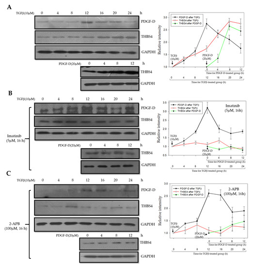 Previously, we confirmed that PDGFRβ and Ca2+ signaling proteins mediate changes in THBS4 through PDGF-D stimulation. However, to validate that TGFβ increases PDGF-D, and, ultimately, affects THBS4, we treated DLD-1 cells with TGFβ for 0, 4, 8, 12, 16, 20, and 24 h and identified the expression levels of PDGF-D and THBS4. We found that, after TGFβ treatment in DLD-1 cells, the relative intensity of PDGF-D peaked at 12 h and gradually decreased over time, while, that of THBS4, increased from 12 h to 20 h. We treated the same cells with PDGF-D for 12 h and found that the THBS4 relative intensity peaked at 8 h after PDGF-D treatment. This was consistent with the highest expression of PDGF-D at 12 h after TGFβ treatment (Figure 5A). Results of TGFβ treatment in the presence of the PDGFRβ-inhibitor, imatinib, showed an elevated relative intensity level for PDGF-D at 12 h after treatment, which is similar to that of cells without the addition of imatinib. However, THBS4 levels remained low after the addition of PDGF-D in imatinib-treated cells, which indicates the significance of PDGFRβ on THBS4 upregulation (Figure 5B). TGFβ treatment in cells cultured with 2-APB also showed increased PDGF-D expression at 12 h but did not significantly alter THBS4 levels nor did the addition of PDGF-D have any significant effect on THBS4 (Figure 5C). These results provide further evidence that TGFβ increases PDGF-D and PDGF-D subsequently increases THBS4 through PDGFRβ in a sequential manner, and Ca2+ signaling proteins also function as in our proposed mechanism.