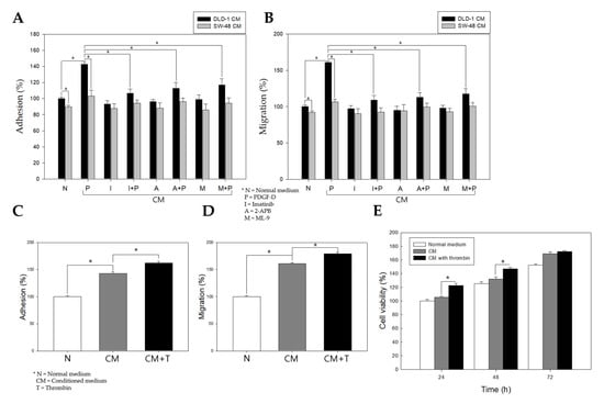 Effect of DLD-1 cell conditioned medium (CM) stimulated with PDGF-D and additional thrombin treatment on CCD-18co cells. (A,B) Adhesion and migration of CCD-18co cells cultured with DLD-1 CM stimulated with PDGF-D (P), imatinib (I), I + P, 2-APB (A), A + P, ML-9 (M), and M + P. DLD-1 cells were treated with imatinib 5 M, 2-APB 100 or ML-9 100 for 16 h, and then PDGF-D 20 additionally treated for 8 h. (C,D,E) CCD-18co cells were cultured with CM or CM with thrombin (1 U/mL) (CM + T) of DLD-1 cells stimulated with PDGF-D 20 for 8 h and subjected to an adhesion assay, migration assay, and an 3-(4,5-dimethylthiazol-2-yl)-2,5-diphenyl tetrazolium bromide (MTT) assay. All experiments were performed in duplicate in three independent experiments. * p < 0.05, compared with normal or CM t-test.