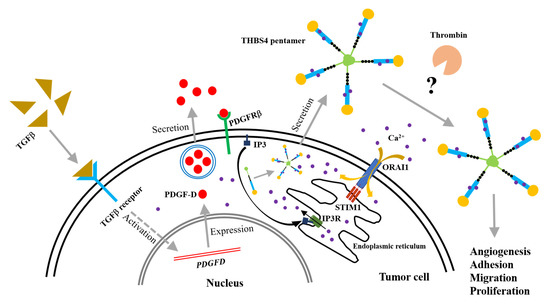 Based on these results, we hypothesize: (1) TGFβ secreted by CRC cells activates TGFβ receptors in tumor cells and increases expression of PDGF-D, (2) secreted PDGF-D subsequently activates PDGFRβ to be overexpressed in tumor cells through autocrine or paracrine mechanisms. Following this, PDGFRβ activates the IP3 signaling molecule in the plasma membrane to stimulate its corresponding Ca2+ release channel, IP3R, from the ER. (3) Following the functioning of IP3R, the Ca2+ inside the ER is released into the cytoplasm, and through Ca2+ binding, the incomplete form of THBS4 is transformed into the complete THBS4 pentamer in the ECM. (4) THBS4 is secreted into the extracellular space and induces angiogenesis, adhesion, migration, and proliferation of tumor tissue, which is further promoted by thrombin. (5) Lastly, this response leads to a partial depletion of Ca2+ inside the ER, which further increases the secretion of THBS4 through STIM1, as well as intracellular Ca2+ influx into the cytoplasm (Figure 7).