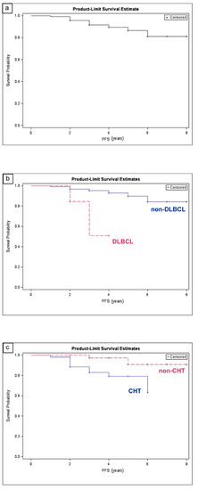 Table 3 shows the PFS along with univariate and multivariate analyses. On multivariate analysis, the histopathologic subtype DLBCL (Figure 1b) and chemotherapy treatment (Figure 1c) retained statistical significance for a poorer PFS, with hazard ratios of 8.581 (p = 0.0112) and 9.239 (p = 0.0094), respectively.