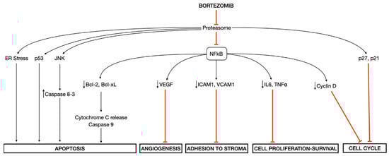 Besides inducing ER stress in MM cells [,], bortezomib prevents the degradation of an inhibitory molecule IκB with the consequent suppression of transcription factor nuclear factor-κB (NF-κB) pathway, which regulates the expression of genes involved in cell growth and survival, cell cycle regulation, angiogenesis, inflammation, interactions between tumor cells and bone marrow stromal cells, and anti-apoptotic mechanisms []. Other proposed mechanisms of cellular toxicity induced by bortezomib are the direct induction of caspase-mediated apoptosis via the activation of the c-Jun NH2-terminal kinase (JNK) pathway and the phosphorylation of p53, and the cell-cycle G1 arrest via increased levels of cyclin-dependent kinase inhibitors p27 and p21 [,] (Figure 1).