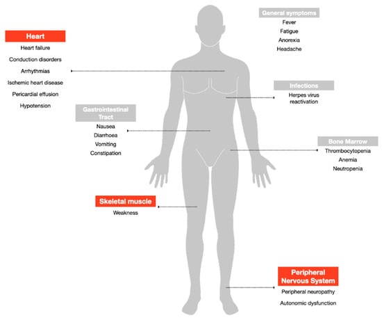 Adverse events associated with bortezomib treatment. Highlighted in red the side effects addressed in the review.