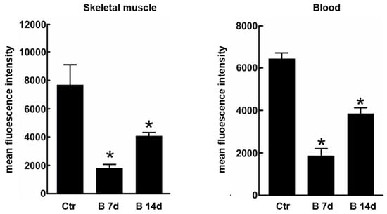 Chymotrypsin-like proteasome activity in skeletal muscle and blood of control mice and mice treated for 7 or 14 days with bortezomib. Chymotrypsin-like activity decreases significantly in skeletal muscle and blood of treated mice compared to control group. The graph presents mean fluorescence intensity ± SD; n = 3; * p < 0.05 vs controls in one-way Anova with Dunnet’s post hoc test.