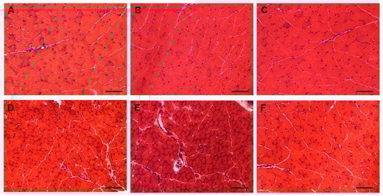Light microscopy of gastrocnemius (A–C) and tibialis anterior (D–F) muscles from control mice (A,D) and mice treated for 7 (B,E) or 14 days (C,F) with bortezomib. H&E stain shows no morphological abnormalities in control mice and in mice treated with bortezomib. Images were obtained with obj ×20. Bars: 100 μm.