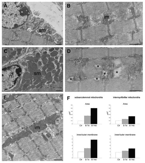 Transmission electron micrographs of gastrocnemius muscles from control mice (A,B) and mice treated for 14 days with bortezomib (C–E). Note the large-sized subsarcolemmal (sm) and intermyofibrillar (im) mitochondria in C and E compared to the mitochondria in A and B, and the sarcoplasmic enlargements in D (asterisks). Nucleus (n). Bars: 500 nm. (F) Histograms in F show the mean ± SE values of sectional area and inner/outer membrane ratio of subsarcolemmal and intermyofibrillar mitochondria in gastrocnemius muscles from control mice and mice treated for 7 or 14 days with bortezomib. All values are significantly different from each other.