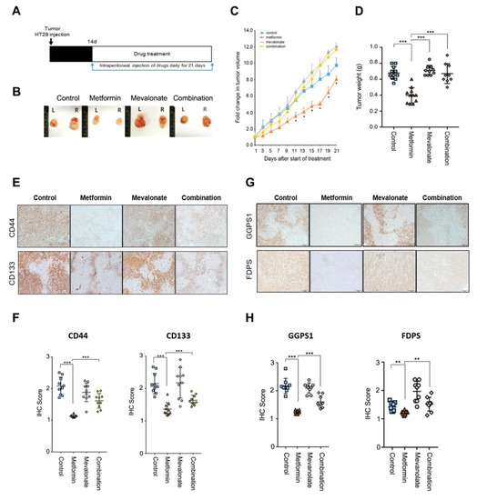 The tumor-suppressing effect of metformin was reversed by addition of mevalonate in a mouse xenograft model. (A,B) HT29 cells were injected subcutaneously into both flanks of nude mice. Implanted mice were randomly and evenly allocated into four groups: vehicle, metformin (by intraperitoneal injection, 250 mg/kg in 200 μL PBS daily), mevalonate (by intraperitoneal injection, 10 mg/kg in 200 μL PBS daily), or the combination of the same daily doses of both metformin and mevalonate. Tumors were measured, and mice were sacrificed on day 21. In mice implanted with HT29 cells, tumor growth (C) and tumor weights (D) were compared between the four groups. In (C), * denotes p < 0.05 for comparison with the combination group. (E) IHC to evaluate expression of CD44 and CD133 was performed on sections of formalin-fixed, paraffin-embedded, dissected xenograft tumor samples from mice treated with vehicle, metformin alone, mevalonate alone, or metformin combined with mevalonate. (F) IHC scores for CD44 or CD133-stained cells were analyzed using Image J. (G) IHC was performed for FDPS and GGPS1 and (H) analyzed using Image J. Magnification, 200×. Data are expressed as the mean ± standard error; n = 10 per group. * p < 0.05, ** p < 0.01, and *** p < 0.001.