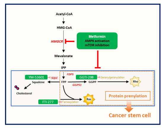 However, there are no data that elucidate the direct relationship between metformin-induced suppression of CSCs and its detailed mechanism in the MVA pathway. Here, we showed that CSC suppression by metformin is associated with inhibition of protein prenylation, rather than cholesterol synthesis, through the MVA pathway.