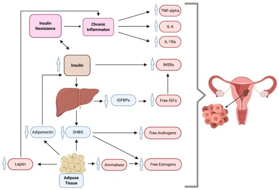A proposed multidimensional model of endometrial cancer development, which suggests insulin resistance, inflammation, and overweight/obesity as driving forces behind cancer. IGFs, insulin-like growth factors; IGFBPs, insulin-like growth factor binding proteins; IL-1Ra, interleukin 1 receptor antagonist; IL-6, interleukin 6; INSR, insulin receptor; SHBG, sex hormone-binding globulin; TNF-alpha, tumor necrosis factor-alpha. Compiled from References [,,,,,].