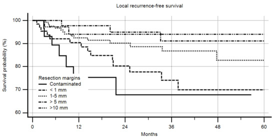 In the study of Dickinson et al., in 2006 on 279 patients, margins of 1–4 mm, 5–9 mm, and 10–19 mm showed about the same rate of LR [40]. Margins of <1 mm or contaminated margins proved to be worse. Our own data with a very homogenous patient cohort showed about the same but was also able to differentiate better between the 1–4 mm, 5–9 mm, and the >10 mm groups.