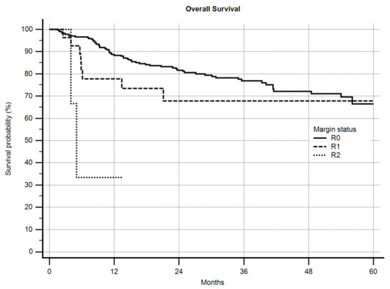 Figure 5. Overall survival by margin in detail, n = 305, p = 0.0288.