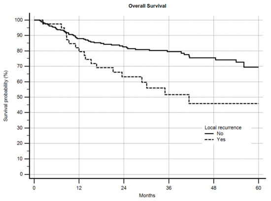 Figure 3. Overall survival by local recurrence, n = 305, p = 0.0018.
