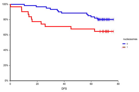 The characteristics of patients is summarized using mean (range) for continuous variables and frequency (percentage) for categorical variables. The median follow-up period was calculated as the median observation time among all patients and among those who were still alive at the time of their last follow-up. Disease-free survival (DFS) was calculated from the date of blood sampling to the date of disease recurrence (locoregional or distant), secondary cancer, death, or last follow-up. DFS was estimated using the Kaplan–Meier product limit method and compared between groups by log-rank test. For survival analysis, circulating nucleosomes were dichotomized to “low” or “high” (nucleosome level below vs. above mean, respectively). Univariate analyses with Chi squared or Fisher’s exact test were performed to find associations between prognostic factors.