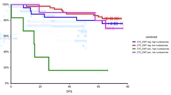 Kaplan–Meier estimates of probabilities of disease-free survival according to plasma nucleosome status and CTC_EMT in primary breast cancer patients (n = 92). Patients positive for CTC_EMT and high level of circulating nucleosomes had significantly worse survival compared to all other groups (p = 0.0000003).