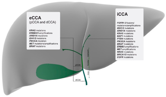 Only recently, with the advent of larger scale genomic profiling, several studies have defined CCAs by their location and, in addition, have described specific mutations for each anatomical subtype. A comprehensive mapping of the most relevant and targetable mutations for each subtype is listed in Figure 1.