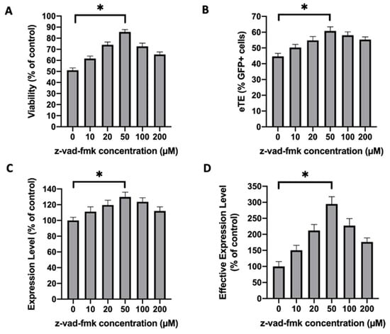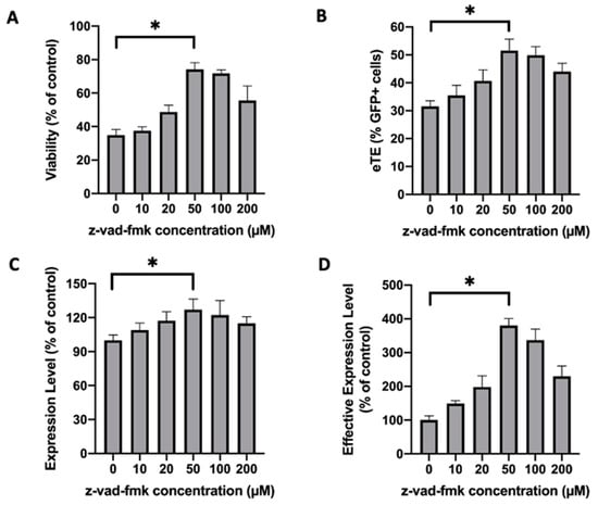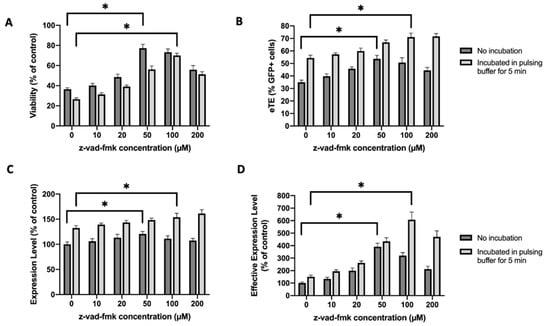 Effects of caspase inhibitor on cell viability and EGFP expression in NIH/3T3 cells. The experimental condition was similar to that in Figure 1, except that NIH/3T3 instead of Jurkat cells were used in the experiment. (A) Cell viability; (B) eTE; (C) expression level; (D) effective expression level. Pulsing condition: 650 V/0.2 cm, 400 µs, 1 pulse. Error bars, SEM; * p < 0.05, Student’s t-test. N = 6.