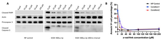 Percent of apoptotic cells after treatment with pharmacological inhibitor. Cells were treated with z-vad-fmk at different concentrations for 8 h post pulsing. (A) Western blot analysis at 8 h post pulsing. (B) Percent of apoptotic cells (Annexin V+). N = 6. NP, non-pulsed. Two pulsing conditions were tested. Condition 1: 650 V/0.2 cm, 400 µs, 1 pulse; Condition 2: 550 V/0.2 cm, 300 µs, 2 pulses, 10 Hz. Error bars, SEM.