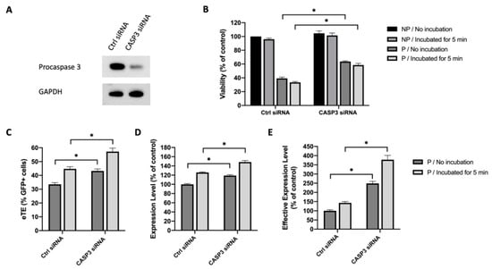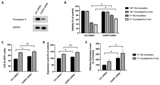Effects of procaspase 3 knockdown on cell viability and EGFP expression in NIH/3T3 cells. (A) Western blot analysis showing the reduction in procaspase 3 expression after procaspase 3 knockdown with CASP3 siRNA treatment; (B) Cell viability; (C) eTE; (D) expression level; (E) effective expression level. Pulsing condition: 650 V/0.2 cm, 400 µs, 1 pulse. NP, non-pulsed control; P, pulsed cells; ns, non-significant. Error bars, SEM; * p < 0.05, Student’s t-test, N = 6.