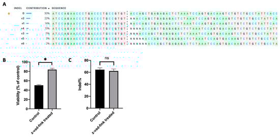 Effects of apoptosis inhibition on cell viability and indel frequency in Jurkat cells. The gene-editing was achieved through electrotransfer of a ribonucleoprotein (RNP) targeting the T cell receptor-α constant (TRAC) gene. (A) Inference of CRISPR Edits (ICE) analysis, showing the outcome of TRAC editing in Jurkat cells; (B) cell viability measured at 24 h; (C) indel within the TRAC gene determined at 48 h post electrotransfer using TIDE analysis. Pulsing condition: 650 V/0.2 cm, 300 µs, 2 pulses, 10 Hz. ns, non-significant. Error bars, SEM; * p < 0.05, Student’s t-test, N = 6.