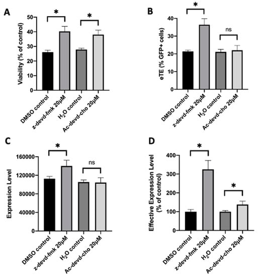 Effects of caspase inhibitors on cell viability and EGFP expression in human primary T cells. The experimental condition was similar to that in Figure 1, except that human primary T cells instead of Jurkat cells were used in the experiment, and that z-devd-fmk and Ac-devd-cho, instead of z-vad-fmk, were used to inhibit cell apoptosis. (A) Cell viability; (B) eTE; (C) expression level; (D) effective expression level. Pulsing condition: 650 V/0.2 cm, 400 µs, 1 pulse. ns, non-significant. Error bars, SEM; * p < 0.05, Student’s t-test. N = 4.