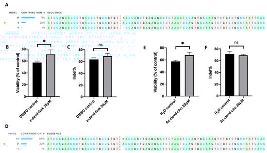 Effects of apoptosis inhibition on cell viability and indel frequency in human primary T cells. The gene-editing was achieved through electrotransfer of an RNP targeting the TRAC gene. (A–C) Apoptosis was inhibited with z-devd-fmk treatment; (D–F) apoptosis was inhibited with Ac-devd-cho treatment. (A,D) ICE analysis, showing the outcome of TRAC editing in T cells; (B,E) cell viability measured at 24 h post pulsing; (C,F) Indel within TRAC gene determined at 48 h post pulsing using TIDE analysis. Pulsing condition: 650 V/0.2 cm, 300 µs, 2 pulses, 10 Hz. ns, non-significant. Error bars, SEM; * p < 0.05, Student’s t-test, N = 4.