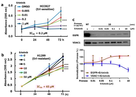 Selection of the Erlotinib-resistant H1299 cell line and Erlotinib binding affinity for its target protein EGFR. (a,b) anti-proliferative effect of Erlotinib in MTT assays in HCC827 (EGFR exon 19 deletion, Erlotinib-sensitive cell line) and H1299 (EGFR WT, Erlotinib-resistant cell line). *** p < 0.001, as determined by Student’s t-tests; (c) DARTS western blotting demonstrating EGFR binding status to Erlotinib. DARTS analysis for detection of EGFR and VDAC1 as an Erlotinib non-binding protein control. H1299 cells were lysed, diluted to 1 mg/mL, and treated with 0.01~10 μM Erlotinib. Next, pronase was administered at 25 °C over a time course. The graph below the western blot shows the quantification of EGFR (Red) and VDAC1 (Blue) in triplicate experiments. For more details, see Materials & Methods of the main text.