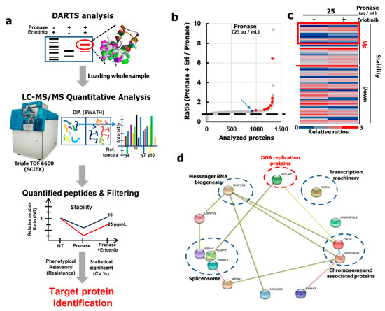 DARTS LC-MS/MS proteome analysis with Erlotinib-treated proteomics using H1299 cell lysates, identifying new Erlotinib binding proteins, responsible for Erlotinib-resistance in H1299 cells. (a) Process for the identification of new Erlotinib binding proteins by DARTS LC-MS/MS; (b) Identified proteins were analyzed by the averaged quantitative SWATH analysis data from the DARTS sample (pronase 25 µg/mL). A blue dot with an arrow shows EGFR protein, an Erlotinib known target, and red dots are corresponding proteins in Figure S2d. The dashed line is 1 (normalized ratio), which demonstrates the stabilized proteins after Erlotinib treatment; (c) The heatmap exhibits relative ratios compared to NT in proteins after pronase treatment with or without Erlotinib. Proteins with ratios greater than 1 were grouped into stability up. The red box area indicates the top 20% of total proteins identified in this study (see Table S2); (d) The results of KEGG mapping and STRING bioinformatics analyses for proteins in the red box area of (c).