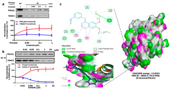 To investigate whether Erlotinib binds to POLA2, we performed DARTS analysis and western blotting. When the cell lysates samples were pretreated with Erlotinib (before pronase treatment), POLA2 stability significantly increased in a dose- and time-dependent manner, even with pronase treatment (Figure S3a,b). Interestingly, even though proteins were degraded by pronase at 20 min, POLA2 bands were still evident on western blotting, suggesting that direct binding of Erlotinib with POLA2 may induce a conformational change in the protein. Under these conditions, we performed DARTS assays to assess the binding affinity of POLA2 with Erlotinib. As shown in Figure 3a, POLA2 conferred stability with saturation at an Erlotinib level of 0.1 µM, whereas VDAC1 levels were severely decreased by Erlotinib treatment and pronase action, implying that Erlotinib does not bind to VDAC1.
