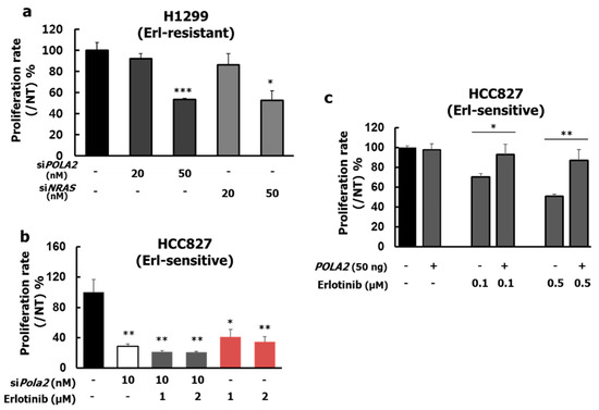 Effects of POLA2 on H1299 proliferation. (a) H1299 cells (Erlotinib-resistant line, high POLA2 expression) were transfected with scrambled siRNA, POLA2 siRNA (siPOLA2), or NRAS siRNA (siNRAS) for 96 h. Cells were then used in 3-h MTT assays; (b) HCC827 cells (Erlotinib-sensitive line, low POLA2 expression) were transfected with either scrambled siRNA or POLA2 siRNA (siPOLA2) for 72 h. Cells were then used in 3-h MTS assays; (c) POLA2 overexpression rescued the anti-proliferative effect of Erlotinib. Values represent means ± SE; The data presented are the result of four independent experiments. Empty or POLA2 vectors (50 ng) were transfected into HCC827 cells for 4 h. Erlotinib was given at the indicated concentrations for 72 h. *** p < 0.001, ** p < 0.01, and * p < 0.05 versus control as determined by Student’s t-tests.