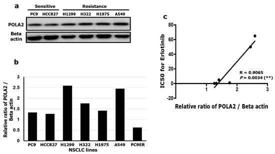 Erlotinib efficacy is POLA2 level dependent. (a,b) POLA2 expression in Erlotinib-sensitive cell lines (PC9 and HCC827) and Erlotinib-resistant cell lines (H1299 and A549); (c) Pearson correlation graph between the IC50 of Erlotinib and the relative ratio of POLA2/beta actin in four cell cell lines tested. ** p < 0.01 versus control as determined by Student’s t-tests.
