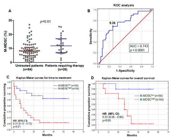 2.3. High M-MDSC Percentage Is a Negative Prognostic Marker for Time-to-Treatment and Survival Time