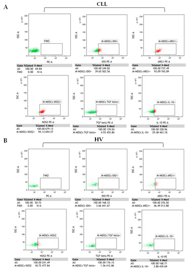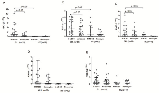 2.4. IDO, ARG1, NOS2, IL-10, and TGF-Β1 Are Overexpressed by CLL-Derived M-MDSC