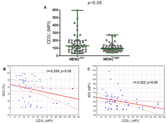2.5. The CD3 Ζ Chain (CD247) Expression in T Lymphocytes Is Significantly Lower in the M-MDSChigh Group