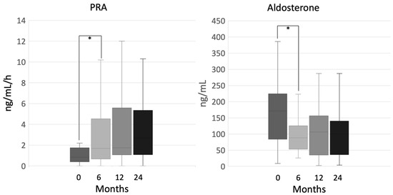 After six months, plasma renin activity (PRA) values were markedly increased (0.9 ng/mL/h (0.2–2.2) at baseline vs. 1.7 ng/mL/h (0.1–10.2) at 6 months, p = 0.003), and aldosterone significantly decreased (171 ng/mL (9–386) at baseline vs. 88 ng/mL (26–223) at 6 months, p = 0.004), while no statistically significant variation occurred at the following time-points (Figure 2).