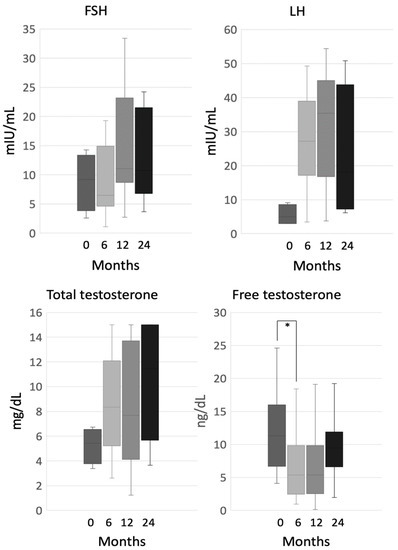 We evaluated the pituitary-gonadal axis in 35 male patients, and we observed a nonsignificant increase in follicle-stimulating hormone (FSH), luteinizing hormone (LH) and total testosterone levels, either after 6 months (FSH, 9.2 mIU/mL (2.6–14.3) at baseline vs. 6.5 mIU/mL (1.1–19.3) at 6 months, p = 0.18; LH, 5.0 mIU/mL (2.9–9.1) at baseline vs. 27.1 mIU/mL (8.4–49.3) at 6 months, p = 0.18; total testosterone, 5.4 mg/dL (3.4–6.7) at baseline vs. 8.3 mg/dL (2.6−15) at 6 months, p = 0.26), or during the whole period of observation (Figure 4). Conversely, in the first six months, sex hormone-binding globulin (SHBG) levels significantly increased (45.8 nmol/L (27.2–130) at baseline vs. 180 nmol/L (20.7–180) at 6 months, p = 0.003), and free testosterone values significantly dropped (11.3 ng/dL (4–24.6) at baseline vs. 5.3 ng/dL (0.9–18.4) at 6 months, p = 0.035), while no statistically significant variation occurred at the following time-points (Figure 4).