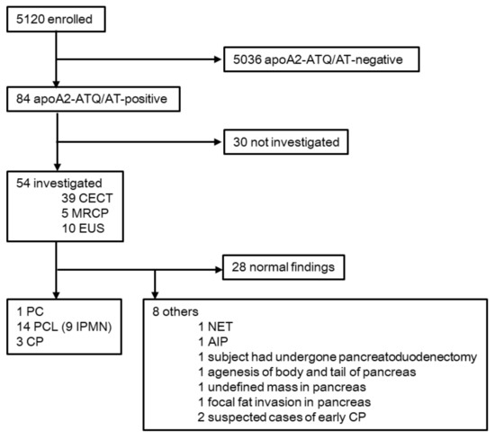 Flow diagram of the screening study. All subjects had plasma apoA2-ATQ/AT levels determined. The apoA2-ATQ/AT cut-off for a positive value was ≤35 μg/mL. CECT, contrast-enhanced computed tomography; MRCP, magnetic resonance cholangiopancreatography; EUS, endoscopic ultrasonography; PC, pancreatic cancer; PCL, pancreatic cystic lesions; IPMN, intraductal papillary mucinous neoplasms; CP, chronic pancreatitis; NET, pancreatic neuroendocrine tumors; AIP, autoimmune pancreatitis.