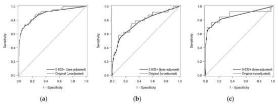 Receiver Operating Characteristic (ROC) curve analysis of the utility of the plasma apoA2-ATQ/AT level for detecting PC and high-risk (HR) status. The gray line shows the original ROC curve, and the black line indicates the bias-adjusted ROC curve created using the 0.632+ bootstrap method: (a) the plasma apoA2-ATQ/AT level exhibited area under the ROC curve (AUC) values of 0.889 for detecting PC; (b) AUC values of 0.767 for detecting PCL; and (c) AUC values of 0.863 for detecting CP.