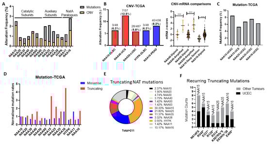 Genomic alteration of N-terminal acetyltransferase (NAT) genes across The Cancer Genome Atlas (TCGA) pan-cancer study of 32 cancer types. (A) Oncoprint displaying average frequency of copy number variants (CNV) and mutations for each NATs across cancer types; (B) Tumour types with greater than 5% frequency of NAT amplifications or deletions (left panel) and association between amplification and mRNA levels in tumours (right panel). DLBC—Lymphoid Neoplasm Diffuse Large B-cell Lymphoma, UCS—Uterine Carcinosarcoma, LUSC—Lung squamous cell carcinoma; (C) Tumour types with greater than 5% frequency of NAT mutations. UCEC—Uterine Corpus Endometrial Carcinoma; (D) counts of missense and truncating mutations for NAT genes across TCGA Pan-Cancer study normalised to protein length. Mutation counts for each NAT gene were normalised first to the length of the associated ORF and then to the corresponding value of NAA10. For NAA80, mutation data were not available; (E) Pie-chart depicting the frequency of truncating mutations for every NAT gene across the TCGA pan-cancer study; (F) Mutational count of recurring (at least three occurrences) truncating mutations of NAT genes in UCEC and other tumour types. *** p < 0.001 Student’s t-test.