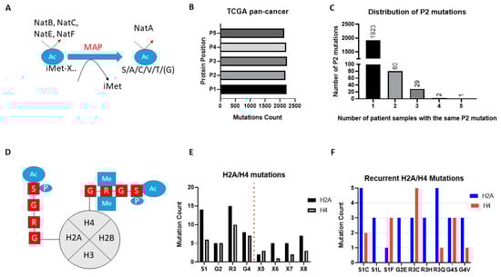 Mutations affecting NAT protein substrates across 32 cancer types. (A) Schematic of Nt-Ac of broad-spectrum NATs. NatB, NatC, NatE, NatF directly methylate the iMET of substrate proteins. The substrate specificity of these NATs is determined by the amino acid adjacent to the methionine. After removal of iMET proteins through the action of MAP, N-termini with the first amino acid being S/A/C/T/V/G can be Nt-Ac through the action of NatA; (B) Missense mutational count for first five amino acids (P1–P5) across TCGA pan-cancer; (C) Distribution of missense mutations of P2 of proteins across TCGA pan-cancer; (D) Schematic of NAA40 recognition and Nt-Ac of histone H2A and H4; (E) Total missense mutational count of the first four amino acids (SRGR) across TCGA pan-cancer study; (F) Counts of recurring missense mutations (at least two occurrences) affecting the SRGR sequence in H2A or H4.