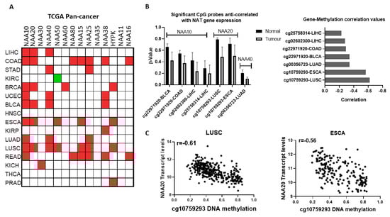 Transcriptional and epigenetic deregulation of NAT genes between normal and tumour tissues; (A) Comparison of NAT transcript levels in tumour and adjacent normal tissue from TCGA pan-cancer study. Significantly (p < 0.05) upregulated transcripts are depicted as red boxes, downregulated transcripts are depicted as green colour boxes; (B) DNA methylation probes displaying significant alterations in their methylation levels and anticorrelation with NAT transcript levels in Bladder Urothelial Carcinoma (BLCA), Colon adenocarcinoma (COAD), Liver hepatocellular carcinoma (LIHC), Lung squamous cell carcinoma (LUAD), and Oesophageal carcinoma (ESCA) tumours; (C) Plots of NAA20 transcript levels (Y-axis) vs. DNA methylation levels for probe cg10759293 (X-axis) in LUSC and ESCA tumours.