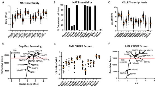 To verify the reliability and reproducibility of the CRISPR KO data on NAT essentiality, we also examined an independent genome-wide CRISPR screen performed on 14 acute myeloid leukemia (AML) cell lines [] (Figure 4E,F). Overall, the same patterns of dependency were observed between the two CRISPR datasets, with the exception of NAA38, which displayed a much higher gene effect in the AML dataset than in the DepMap study. This was not due to the different cancer types examined in the two datasets, since NAA38 is also redundant in AML cell lines found within the DepMap study (gene effect for AML cell lines −0.03419 ± 0.09295). The diverse results for NAA38 are therefore probably due to the technical variability between the two studies. Thus, in these two independent CRISPR KO datasets, NatA, NatB, and NatE are commonly essential to cancer cell lines, NatC and NatD are essential to some cell lines, while loss of NatF and NatH was tolerated.