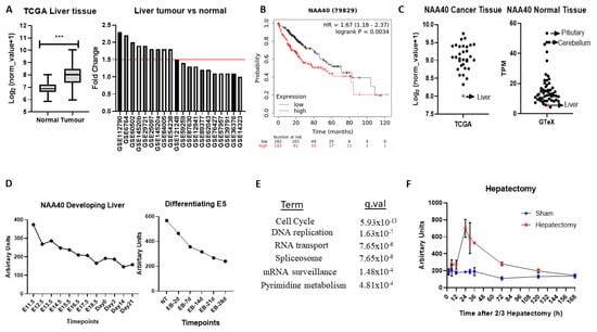 NAA40 is associated with liver proliferation and cancer. (A) NAA40 transcript comparison between normal and tumour liver tissue in TCGA (left panel) and 20 studies from GEO omnibus (right panel); (B) KM plot for liver cancer, with samples divided according to median NAA40 expression; (C) Transcript levels of NAA40 in TCGA pan-cancer (left panel) and GTeX study (right panel). Each circle represents mean transcript value of one tissue type, with arrow indicating relative levels of liver; (D) Timecourse of NAA40 transcript levels in developing liver (left panel) and in Embryonic Stem (ES) cells differentiating to hepatocytes (right panel); (E) KEGG enriched terms among 1000 top co-expressed genes in 107 liver cancer datasets (q < 0.001); (F) Time course of NAA40 transcript levels in regenerating liver following 2/3 hepatectomy. *** p <0.001 Student’s t-test.