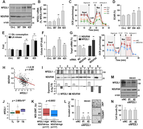 Previously, we reported that NFE2L1 mRNA expression is commonly upregulated in response to diverse mitochondrial defects, such as OXPHOS inhibition and mitochondrial DNA depletion [22]. To elucidate the functional and mechanistic involvement of NFE2L1 in hepatoma cell activity, we examined protein levels in several hepatoma cell lines with (SNU354 and SNU423) or without (SNU387 and Ch-L) mitochondrial defects. Compared to SNU387 and Ch-L cells, SNU354 and SNU423 hepatoma cells had higher NFE2L1 protein levels (Figure 1A), corresponding to the NFE2L1 mRNA level (Figure 1B). We also observed that SNU354 and SNU423 have lower levels of NDUFA9 protein, which is a subunit of OXPHOS complex I (Figure 1A), and lower oxygen consumption rate (OCR) activities (both ATP-linked basal OCR and maximal OCR including spare capacity) than SNU387 and Ch-L cells (Figure 1C). However, SNU354 and SNU423 possessed increased extracellular acidification rates, extracellular lactate levels, and glucose consumption rates (Figure 1D,E), eventually showing increased cellular ATP levels (Figure 1F). NDUFA9 knockdown was enough to suppress complex I-associated OCR (Figure 1G, right) [23] and increased NFE2L1 mRNA expression (Figure 1G, left). These results imply that NDUFA9 depletion may be one of the causes of OXPHOS defect and an upstream event of NFE2L1 expression in hepatoma cells. An inverse association between NFE2L1 and NDUFA9 expression in HCC was found by analyzing the RNA-seq data of TCGA-LIHC (n = 371; Figure 1H). When we monitored NFE2L1 and NDUFA9 protein levels using six paired HCC and adjacent tissue samples, four cases showed clearly increased NFE2L1 expression in tumor compared to the surrounding tissue. Three of these cases had decreased NDUFA9 expression (Figure 1I), supporting the results of the TCGA analysis. Next, we compared the NFE2L1 expression levels among tissue types with clinical aggravation in TCGA-LIHC and observed a tendency of increasing NFE2L1 from normal liver tissue to primary tumor and recurrent tumor (Figure 1J). Thus, we asked whether the NDUFA9-associated NFE2L1 expression contributed to hepatoma cell invasiveness. We divided the primary LIHC samples into two groups based on the median expression of both NFE2L1 and NDUFA9: high NFE2L1 and low NDUFA9 expression (NFE2L1-high/NDUFA9-low) and low NFE2L1 and high NDUFA9 expression (NFE2L1-low/NDUFA9-high). Then, we compared the enrichment of the epithelial–mesenchymal transition (EMT) signature genes between the groups. The NFE2L1-high/NDUFA9-low group was more enriched in EMT signature genes than the other group (Figure 1K), implying that the NDUFA9-associated NFE2L1 expression may play a key role in hepatoma cell invasiveness. Furthermore, siRNA-mediated NFE2L1-knockdown in SNU423 cells significantly diminished the cell invasion activity without affecting cell growth and NDUFA9 expression (Figure 1L–N). Taken together, these results indicate that NFE2L1 is a key regulator of hepatoma cell invasiveness, and NDUFA9 depletion is an upstream driver of OXPHOS defect and NFE2L1 upregulation in HCC tumors.