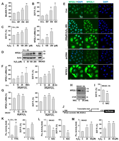 Next, we addressed how the OXPHOS defect regulates NFE2L1 gene transcription. SNU354 and SNU423 cells, which harbored low OCR activity, expressed higher levels of both mitochondrial and total cellular ROS than SNU387 and Ch-L cells (Figure 2A,B). When the intracellular ROS level was increased by exposing Ch-L cells to exogenous H2O2, both the mRNA and protein levels of NFE2L1 were significantly increased (Figure 2C,D). NFE2L1 acts as a TF after being processed in the endoplasmic reticulum (ER) and translocated into the nucleus [15]. Therefore, we examined alterations in the cellular localization of NFE2L1 in response to intracellular ROS. In Ch-L cells, NFE2L1 was basally dispersed in both the nucleus and cytoplasm, and nuclear NFE2L1 was further increased by H2O2 treatment (Figure 2E). The cytoplasmic and nuclear localization of NFE2L1 was further confirmed by its overexpression (Figure 2E, bottom). Notably, some cells were enlarged by 200 μM H2O2 treatment. The time course response of NFE2L1 mRNA expression to H2O2 treatment was observed in both Ch-L and SNU387 cells (Figure 2F,G). SNU387 cells were more vulnerable to H2O2 than Ch-L cells. Therefore, we used 50 μM H2O2 for SNU387 in Figure 2G. In addition, when we used N-acetyl cysteine (NAC) to decrease the intracellular ROS level in SNU423 cells, which harbor high ROS levels, NFE2L1 expression was clearly decreased (Figure 2H,I).