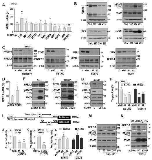 ROS-mediated STAT3 activation is the upstream regulator of NFE2L1 expression. (A) After introducing siRNAs for the 11 TFs individually to SNU423, the NFE2L1 mRNA level was monitored by qRT-PCR. ** p < 0.01 vs. siNC by the Student t-test. (B) Western blot (Figure S3) analysis for protein levels of four selected TFs (USF2, c-Jun, SREBP1, and STAT3) and phosphorylated status on tyrosine 705 of STAT3 (pSTAT3, Y705). *, The truncated active form of SREBP1 was also detected. (C) Western blot analysis (Figure S3) after siRNAs for the four TFs were individually introduced into SNU423 for 72 h. #1 and #2 indicate two different siRNAs for individual target genes. (D,E) Ch-L was transfected with pcDNA3-STAT3-HA plasmid for 48 h and subjected to qRT-PCR (D) and Western blot analysis (E) (Figure S4). ** p < 0.01 vs. mock transfection with pcDNA3 plasmid (pcDNA) by the Student t-test. (F) SNU387 was transfected with pcDNA3-STAT3-HA for 48 h and subjected to Western blot analysis. (Figure S4) (G) SNU423 was treated with 25μM AG490 (a STAT3 inhibitor) for 24 h and subjected to Western blot analysis. (Figure S4) (H) SNU423 was transfected with siSTAT3 for 72 h and qRT-PCR was performed to monitor NFE2L1 and STAT3 mRNA level. ** p < 0.01 vs. siNC by the Student t-test. (I) Schematic diagram of NFE2L1-pGL3 reporter plasmids with the indicated promoter length (1899 bp or 443 bp). The open square boxes indicate two putative STAT3 binding sites located in +67 to +80 and +174 to +189 bps. (J) Promoter assay was performed after SNU423 was transfected with siSTAT3 for 12h and then with the NFE2L1 promoter reporter plasmid (1899 bp) for 48 h. (K) SNU423 was transfected with the 1899 bp promoter reporter plasmid together with pcDNA–STAT3–Y705F dominant negative mutant plasmid and for 48 h and then subjected to promoter assay. (L) Promoter assay was performed after Ch-L was transfected with the two NFE2L1 promoter reporter plasmids, 1899 bp (left) and 443 bp (right), together with pcDNA-STAT3 or pcDNA-STAT3-Y705F mutant plasmid for 48 h. (M) Ch-L was treated with the indicated concentrations of H2O2 for 48 h and subjected to Western blot analysis. (Figure S4) (N) Ch-L was transfected with STAT3 WT or mutant plasmids for 48 h and then exposed to 300 µM H2O2 for 12 h. Western blot analysis (Figure S4) was performed. In J to L, ** p < 0.01 vs. pcDNA or siNC by the Student t-test.