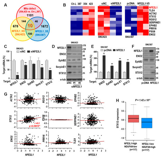 Identification of downstream target genes commonly upregulated by mitochondrial defect and NFE2L1. Transcriptome data of four cell lines (Ch-L and SNU387 harboring active mitochondria, and SNU354 and SNU423 harboring defective mitochondria) were obtained from our previous report [22]. Two independent sets of SNU387 cells transfected with pcDNA-NFE2L1 plasmid (NFE2L1_OE) for 48 h and of SNU423 cells with siNFE2L1 (NFE2L1_KD) for 72 h were applied to cDNA microarray for transcriptome profiling. (A) Venn diagram of commonly upregulated genes with mitochondrial defect (Mito defect, SNU354 and SNU423 vs. Ch-L and SNU387) and NFE2L1-dependent regulation. (B) Heatmaps show the expression of 10 commonly upregulated genes in four hepatoma cell lines (left), NFE2L1-depleted SNU423 cells (middle), and NFE2L1-overexpressed SNU387 cells (right). Each column and row represent independent samples and the indicated genes, respectively. Red and blue color indicates the high and low expression, respectively. (C,E) Validation of four target mRNA levels by qRT-PCR. (D,F) Validation of four target protein levels by Western blot analysis. #1 and #2 indicate two different siRNAs for NFE2L1. (Figure S5) ** p < 0.01 vs. pcDNA or siNC by the Student t-test. (G) Associations of NFE2L1 with the 10 commonly upregulated genes were evaluated using the TCGA-LIHC cohort (n = 371). Pearson’s product moment correlation test was performed. The correlation estimate and the p-value with statistical significance are marked. (H) Boxplot for STX12 expression level of primary HCC tissues from the TCGA-LIHC cohort. Bottom, middle, and top lines of each box indicate the first quartile, median, and third quartile values, respectively. Whiskers represent the minimum and maximum values. For comparison, primary tumors were divided into two groups, based on the median expression level of NFE2L1 and NDUFA9: a group with both above the median NFE2L1 level and below the median NDUFA9 level, a group with both below the median NFE2L1 level and above the median NDUFA9 level. p-value from Wilcoxon t-test is indicated.
