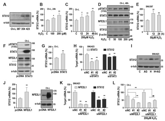 STX12 is a key downstream target of the ROS/STAT3/NFE2L1 axis. (A) Western blotting. (Figure S6) (B–E) Ch-L and SNU387 cells were cultured with different concentrations of H2O2. Validation of STX12 mRNA level by qRT-PCR in Ch-L (B,C) and SNU387 (E) cells. ** p < 0.01; * p < 0.05 vs. C by the Student t-test. (D) Western blot analysis. (Figure S6) (F,G) Ch-L cell was transfected with pcDNA3-STAT3 plasmid (STAT3) for 48 h and then Western blot analysis (F) (Figure S6) and qRT-PCR (G) were performed. (H) SNU423 was transfected with siSTAT3 for 72 h and subjected to qRT-PCR. ** p < 0.01 vs. siNC or pcDNA by the Student t-test. #1 and #2 indicate two different siRNAs for STAT3. (I) SNU423 was exposed to 50 μM H2O2 with or without the pretreatment of 25 µM AG490 (AG), and then Western blot analysis was performed. (Figure S6) (J) Ch-L cell was transfected with pcDNA3-NFE2L1 plasmid (NFE2L1) for 48 h and subjected to qRT-PCR (left) and Western blot analysis (right) (Figure S6). (K) SNU423 was transfected with siNFE2L1 for 72 h and subjected to qRT-PCR. ** p < 0.01 vs. siNC by the Student t-test. #1 and #2 indicate two different siRNAs for NFE2L1. (L) Ch-L was transfected with siNFE2L1 for 24 h and then exposed to 200 µM H2O2 for 48 h. STX12 mRNA level was monitored by qRT-PCR. ** p < 0.01 vs. siNC without H2O2; ## p<0.01 vs. siNC with H2O2 by the Student t-test. #1 and #2 indicate two different siRNAs for NFE2L1.