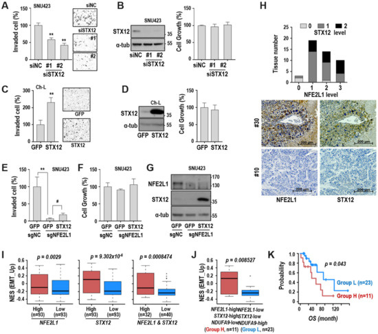 Next, to validate the relationship between NFE2L1 and STX12 protein expression, we performed immunohistochemistry using a liver cancer tissue array. A higher expression (level 2) of STX12 was observed in the tissues with high NFE2L1 expression (Figure 6H). We analyzed again the clinical importance of these findings using the TCGA-LIHC cohort database. When comparing enrichment of the EMT signature based on the expression of NFE2L1 or STX12, the high-expression group of NFE2L1 and/or STX12 exhibited a more enriched EMT signature than the low-expression groups (Figure 6I). To more precisely interrogate the effect of OXPHOS defect on the NFE2L1/STX12-linked EMT profile, we subdivided the groups elected by NFE2L1 and STX12 levels into group H and group L based on the NDUFA9 level. In detail, group H had high NFE2L2 and STX12 but low NUDFA9, implying a high OXPHOS defect-linked feature, and vice versa for group L. Interestingly, group H had a higher enrichment of the EMT signature (Figure 6J). Furthermore, when we compared clinical outcomes between the two groups by using Kaplan–Meier survival analysis, we observed that group H had significantly worse overall survival (Figure 6K). Taken together, these results indicate that NFE2L1/STX12 expression is the key to regulating hepatoma cell invasiveness and may be useful as a prognostic marker for HCC.