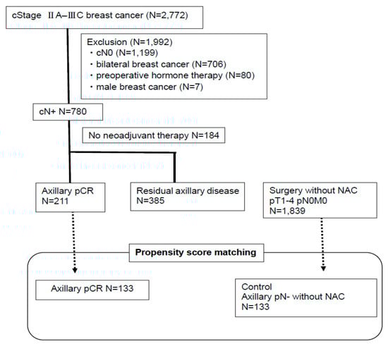 We enrolled patients with stage IIA–IIIC breast cancer who underwent surgery at the Breast Oncology Center, Cancer Institute Hospital, Japanese Foundation for Cancer Research, Tokyo, between January 2007 and December 2012. Patients with clinically node-negative disease, bilateral breast cancer, those who received preoperative hormone therapy, and male patients were excluded. Of the 780 patients with cytologically proven node-positive disease, 596 received NAC. The data of the 596 patients are shown in Table S1. For the control as patients with axillary pN- without NAC, we enrolled patients with pT1-4pN0M0 breast cancer who underwent surgery without NAC at our institution during the same time period (Figure 1). The data of patients for the control are shown in Table S2. The Ethics Committees of Cancer Institute Hospital (# 2018-1100) approved the study protocol on 19 September 2018.