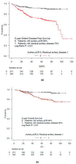 We examined distant disease-free survival (DDFS) and overall survival (OS) according to the pathological response in the LNs (Figure 2a,b). The median follow-up time after primary surgery was 64 months (range, 9–145 months). Patients with axillary pCR showed significantly better DDFS and OS than patients with residual axillary disease (p < 0.01 for both DDFS and OS). The 5 year DDFS rate was 90% in patients with axillary pCR, and 70% in those with residual axillary disease. Multivariate analysis adjusted for other confounding factors related to survival outcome was performed (Table 2). Axillary pCR remained an independent prognostic factor for DDFS after adjustment for clinical stage, ER, HER2, and NG (p < 0.01) (Table 2).